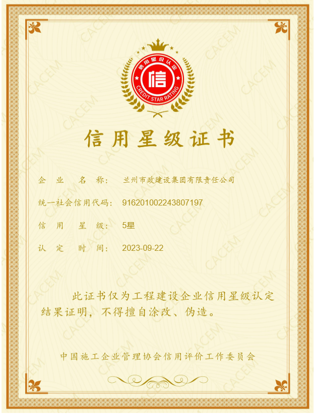 近日,中國施工企業(yè)管理協(xié)會(huì)公布了2023年第十二批工程建設(shè)企業(yè)信用星級(jí)認(rèn)定結(jié)果,蘭州市政建設(shè)集團(tuán)榜上有名,獲五星級(jí)信用認(rèn)定。