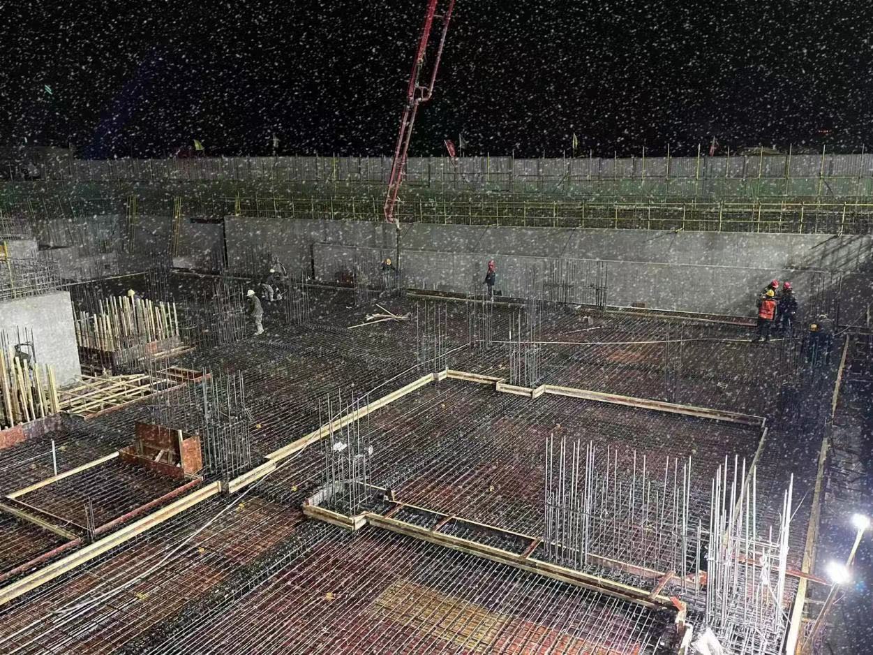 由第一工程公司承建的涼州區(qū)社會(huì)養(yǎng)老院建設(shè)項(xiàng)目已進(jìn)入沖刺四季度的關(guān)鍵期。進(jìn)入10月以來(lái),受強(qiáng)冷空氣影響,涼州區(qū)迎來(lái)了持續(xù)的強(qiáng)降雪天氣。該項(xiàng)目部結(jié)合當(dāng)?shù)靥鞖鉅顩r,提前優(yōu)化施工方案,加強(qiáng)現(xiàn)場(chǎng)巡回檢查頻次,仔細(xì)排查安全隱患,在做好人員防寒保暖的同時(shí),加快項(xiàng)目施工進(jìn)度;現(xiàn)場(chǎng)施工人員頂風(fēng)雪、戰(zhàn)低溫,鼓足干勁,攻堅(jiān)克難,掀起冬季施工大干高潮。截至目前,1#安養(yǎng)樓已完成筏板基礎(chǔ)澆筑,卷材防水鋪設(shè)和保護(hù)層的施工,以及隔震層鋼板的安裝,隔震層梁、板、柱、墻混凝土澆筑,并完成支座安裝;2#安養(yǎng)樓完成防水鋪設(shè)和保護(hù)層施工,完成筏板基礎(chǔ)鋼筋綁扎50%工作量。