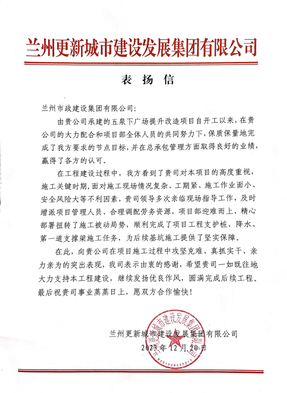 12月20日,蘭州市政建設(shè)集團(tuán)收到業(yè)主單位蘭州更新城市建設(shè)發(fā)展集團(tuán)有限公司的一封表?yè)P(yáng)信。對(duì)公司承建的蘭州市五泉下廣場(chǎng)提升改造項(xiàng)目,在公司各級(jí)領(lǐng)導(dǎo)的高度重視下,在項(xiàng)目部全體參建員工的共同努力下,面對(duì)施工現(xiàn)場(chǎng)情況復(fù)雜、工期緊、施工作業(yè)面小、安全風(fēng)險(xiǎn)大等不利因素,公司領(lǐng)導(dǎo)多次親臨現(xiàn)場(chǎng)指導(dǎo)工作,第四工程公司領(lǐng)導(dǎo)帶班作業(yè),并及時(shí)增派項(xiàng)目管理人員、合理調(diào)配勞務(wù)資源,項(xiàng)目部迎難而上、精心部署,24小時(shí)不間斷作業(yè),扭轉(zhuǎn)了施工被動(dòng)局勢(shì),順利完成了項(xiàng)目工程支護(hù)樁、降水、第一道支撐梁施工任務(wù),保質(zhì)保量地完成了節(jié)點(diǎn)目標(biāo)。在管理方面取得良好業(yè)績(jī),贏得了各方的認(rèn)可,為后續(xù)基坑施工提供了堅(jiān)實(shí)保障。向公司在項(xiàng)目施工過程中攻堅(jiān)克難、真抓實(shí)干、親力親為的突出表現(xiàn)表示由衷的感謝。