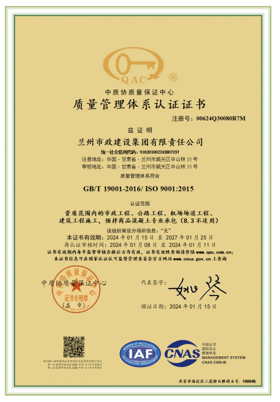 1月23日,蘭州市政建設(shè)集團(tuán)順利通過ISO9001質(zhì)量管理體系、ISO14001環(huán)境管理體系、ISO45001職業(yè)健康安全管理體系再認(rèn)證審核,蘭州市政建設(shè)集團(tuán)已連續(xù)27年通過ISO綜合管理體系認(rèn)證。